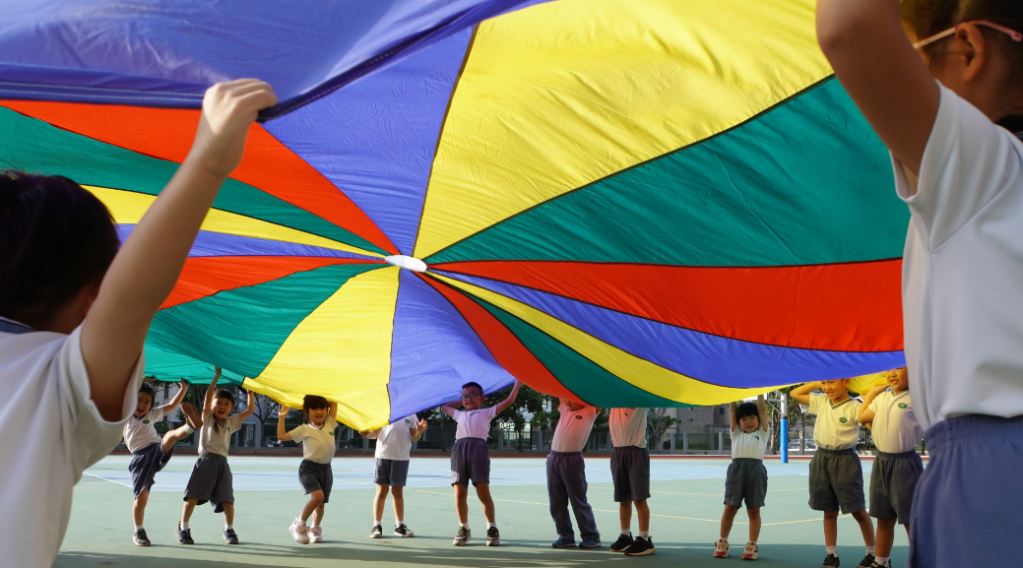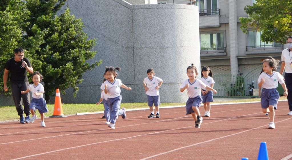 刺激的競賽場中,出現了最有動能的亮點──幼兒園個人賽短跑,小小選手們各個精神抖擻,卯足了勁往前跑,落後的孩子由老師牽起小手來幫忙,變成快樂的大手牽小手跑。短跑結束,出現了色彩繽紛的氣球傘,大家投入專注力,聽從老師指令做出反應,讓老師們感受到孩子成長的腳步又向前邁前一步。