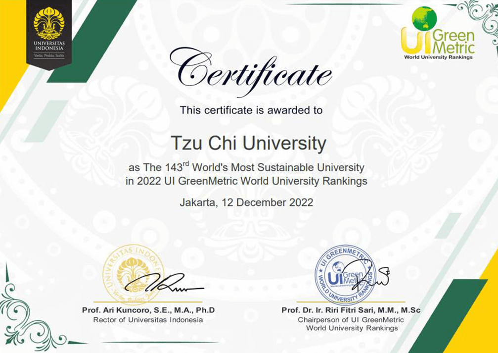 慈濟大學自2017年起參與排名評比,當年度即獲得世界排名第200名, 2022年世界排名為第143名(較2021年進步14名),臺灣排名為第13名(較2021年進步1名),分數增加340分,充分展現慈大多年來推動環境永續的成效。