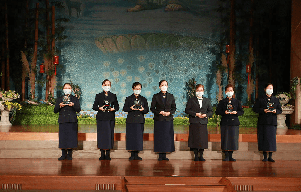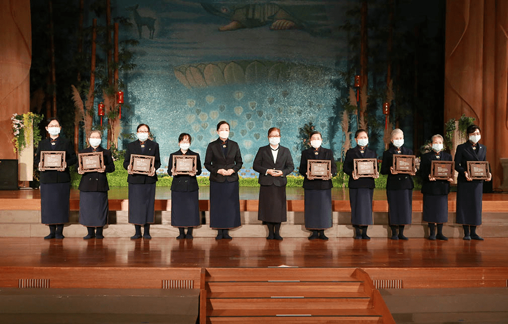 今年共有 13位慈懿會爸爸媽媽承擔滿十周年與6位慈懿會爸爸媽媽承擔滿二十周年,來自台中的楊密媽媽分享:「承擔慈中懿德20年,在慈濟被愛包圍也希望這分愛可以傳遞給每一位陪伴的師生。」在這20年間,除非有不可抗拒因素,楊密媽媽從未請假過,只因謹記證嚴法師叮嚀,社區勤務可以找人承擔,但慈懿會的任務是無人可以替代的。
