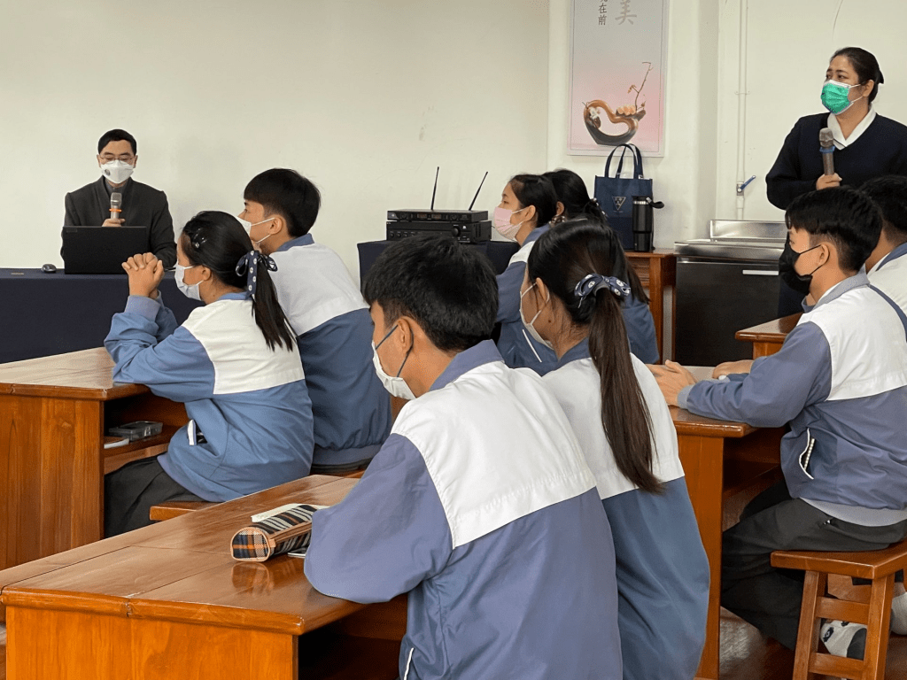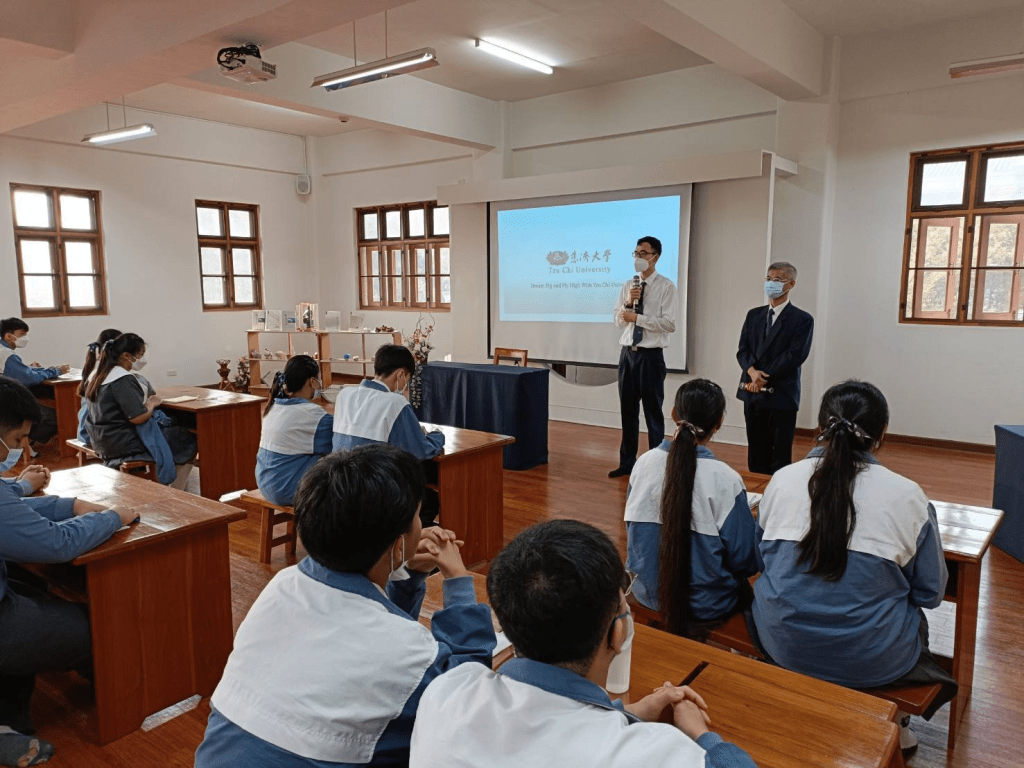 2月1日天還沒亮,師長們就出發前往桃園機場,下機後便前往泰北大谷地華興中學,華興中學創辦於1971年,為泰北地區學生人數較多的華校。高中生對學系的發展其實都還很陌生,為了讓高中生更了解各學系,師長以近期生活案例為比喻進行說明。如慈大醫技系,經詢問學生皆知曉快篩和PCR,而該學系畢業生即是負責PCR的後續檢驗結果。再如傳播系和國際數媒學程,學生對抖音網紅、直播帶貨等非常嚮往,當以推廣行銷、內容設計、法律風險等作為粉絲流量的基礎和學生的生活貼近,拉近與各學系的距離。