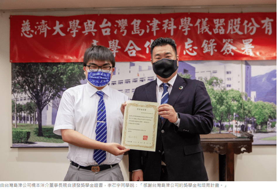 全球科學儀器企業前十大的日本島津製作所,於台灣設立分公司已屆滿十周年,為回饋台灣社會,台灣島津科學儀器股份公司與慈濟大學簽訂產學合作備忘錄,這也是台灣島津公司第一次簽約合作的大專院校,並提供獎學金給慈濟大學醫學檢驗生物技術學系大四(準研究生)李芢宇同學,由慈濟大學劉怡均校長和台灣島津公司橋本洋介董事長代表雙方簽約,期待透過產學合作共同為人類健康,社會進步以及地球永續而努力。