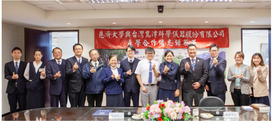 簽約典禮上,包括台灣島津公司和慈濟大學研發處、醫學院師長等蒞臨出席,慈大落實產業鏈結、人才培育、提升研究,期待透過與台灣島津公司的合作,共同為實現人類和地球的健康努力。
