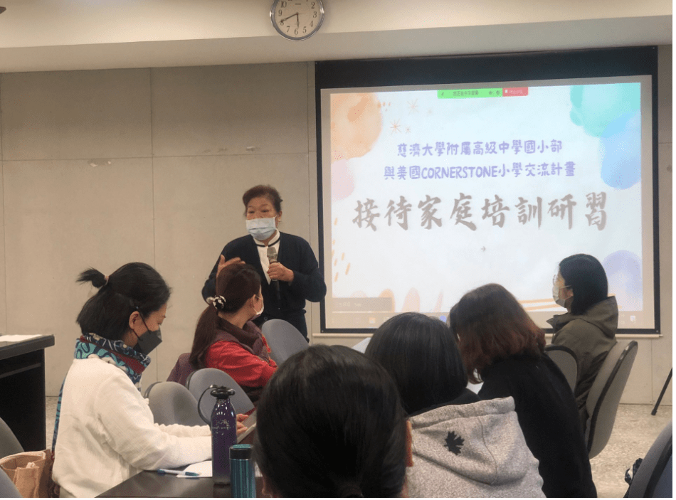 美國Cornerstone小學位於北加州舊金山,因嚮往慈濟人文而來,2022年經過慈濟人牽綫,特別將學生的畢業旅行安排到臺灣花蓮慈小,除深入體驗慈濟人文外,更希望藉由「Home Stay」,從日常生活中體驗台灣在地文化。由於這是慈中史上第一次辦理接待家庭,培訓課程首先由擁有豐富國際交流經驗的李玲惠校長分享自身在美國留學與德國homestay的見聞,詳細的介紹了食衣住行基本生活要注意的文化差異,以及接待家庭成員面對美國小客人時,可以用他們熟悉的語言來做溝通,讓彼此之間能夠更快速的建立關係。