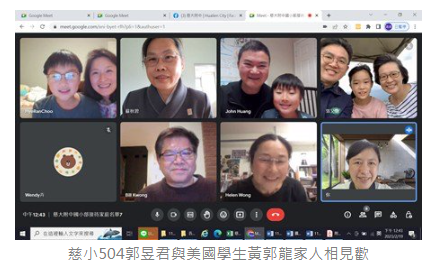 美國Helen Wong校長也透過視訊介紹Cornerstone小學、分享學生的學習點滴,並感恩慈大附中及接待家庭,提供這樣的交流學習機會,讓孩子們有不一樣的畢業學習之旅,為他們打開認識世界的另一扇窗。為了減少初見面的生澀感,學校特別安排雙方家庭雲端相會,連家中的寵物成員都上線打招呼,孩子除彼此介紹家庭成員外,也分享自己喜歡的課程與興趣,畫面歡樂且溫馨。其中一位名為「夏天」的美國學生,弟弟妹妹分別名為春天和冬天,特別分享自己名字的由來,還為不會說中文的爸媽擔任翻譯小天使,一起認識臺灣慈小的學伴。