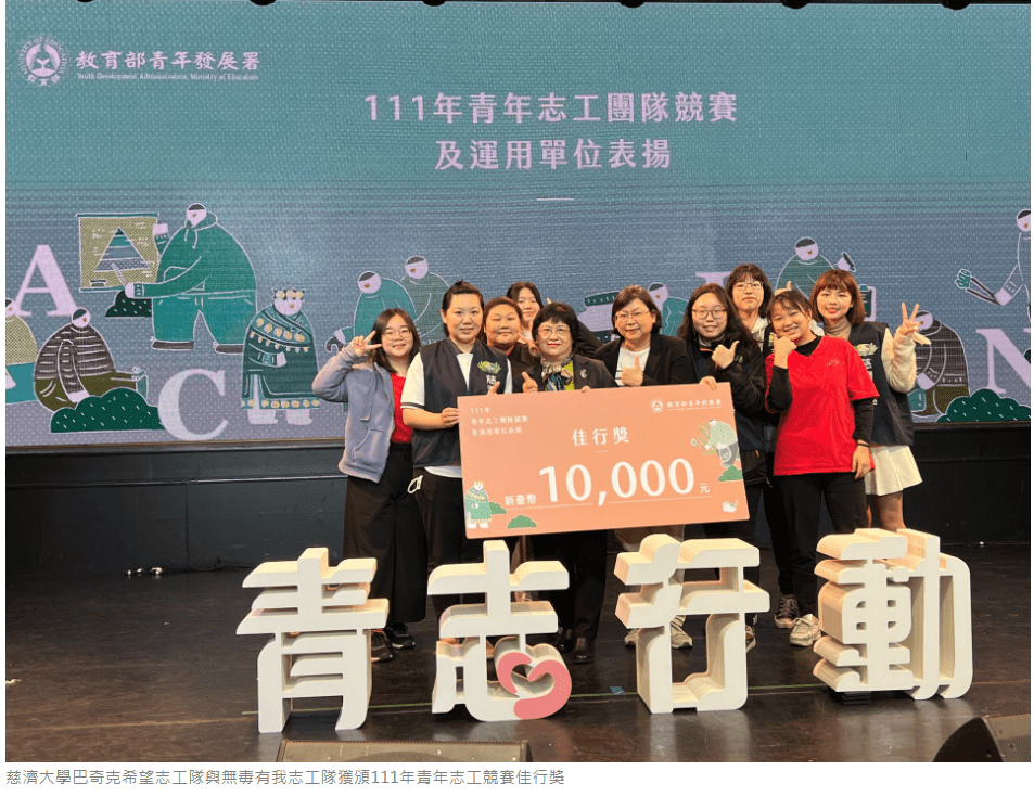由教育部青年發展署舉辦「績優青年志工團隊競賽及運用單位表揚計畫」於3月5日頒獎表揚, 今年共吸引54隊、1千多人、5個運用單位報名參與,最後共29隊進入決審,慈濟大學「巴奇克 Pajiq 希望志工隊」及「慈濟大學無毒有我志工隊」獲得佳行獎,兩支隊伍長期耕耘花蓮在地,獲得肯定。