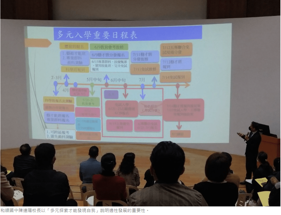 教務處也把握與家長交流的機會,說明就讀本校直升優勢。張齡之主任分享高中數理實驗班及雙語實驗班的入學規定和課程規劃,以及近年高中部優異的升學成績,並表示有多位優秀的孩子,都是從國小便在慈濟優良學風中陶鑄茁壯;姚智化校長則透過分析學測成績,證明臺南慈中學測表現實力,顯示臺南慈中不僅重視品格養成,在生活教育及課業表現上更有亮麗成果。許多國三家長表示,學校人文陶冶及升學規畫令人躍躍欲試。