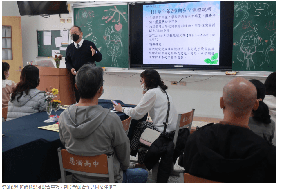 高一包容陳冠廷老師特別透過Google表單、班級社群,使家長了解學校整體辦學理念以及導師班級經營理念,預先使氣氛熱絡。國二善解吳秋宏老師也分享:「藉由親師座談,深刻感受慈濟人文,感恩慈懿爸媽用心布置、陪伴,讓與會的家長溫馨滿滿,也讓親師晤談圓滿。」親師座談中,有家長回饋對於學校相關新規定的看法,書淵老師、松易老師表示,學校能藉此機會宣導辦學理念及因應,達到了良好的親師交流。
