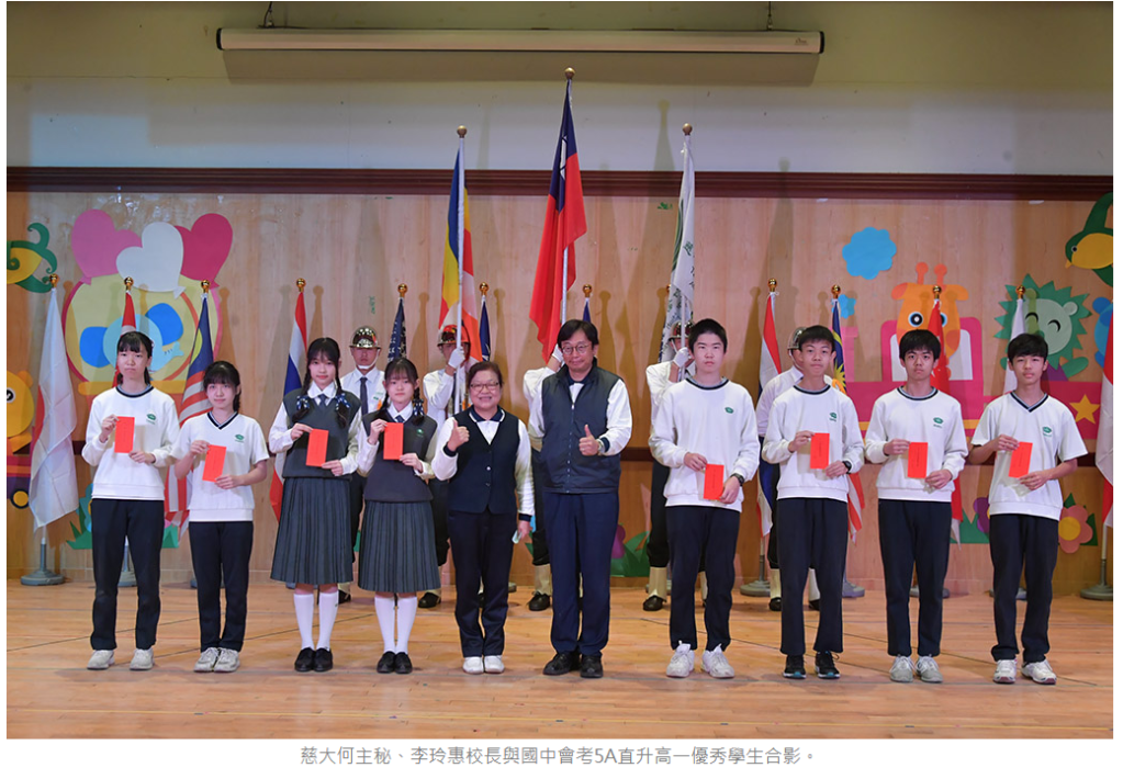 此外,慈中每年都會藉校慶這大日子頒發高中部入學成績優異獎勵。今年國中會考成績亮眼,本學年全花蓮最多5A選讀慈大附中,本校在學雜費全免外,額外補助一萬元獎學金。而日前落幕的111學年度全國學生音樂、舞蹈比賽,慈中學生亦斬獲許多組別的獎項,藉由今天的運動會,頒贈感謝狀給所有指導老師。不論學科或專才皆有所成,足可見慈中人文教育的成功,及一路以來適性揚才教育理念的堅持。