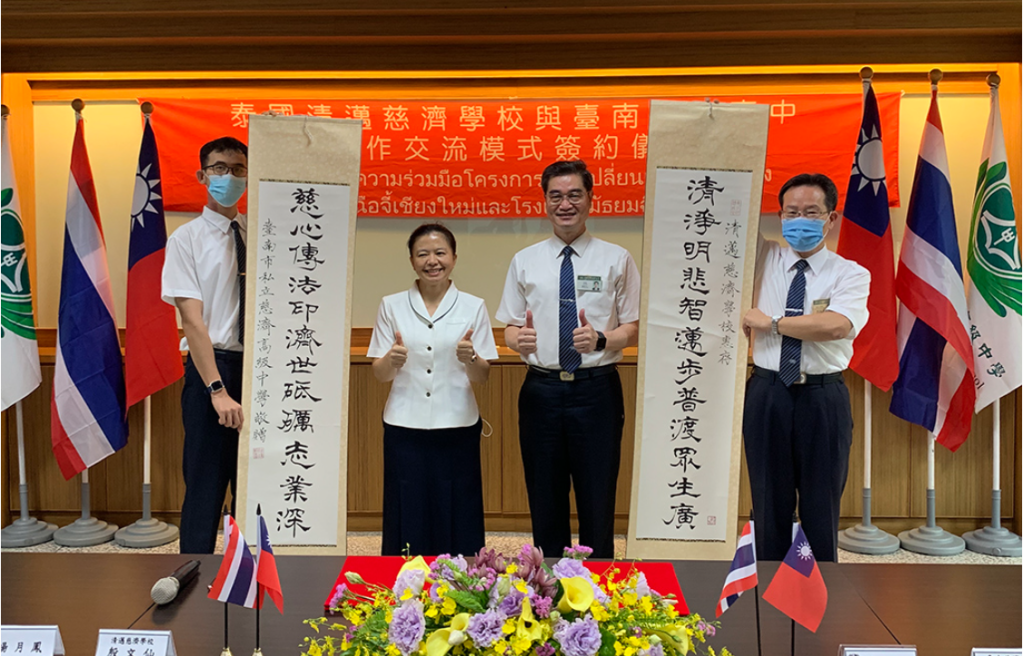 臺南慈濟高級中學於4月24日與泰國清邁慈濟學校進行兩校合作交流備忘錄簽訂儀式。