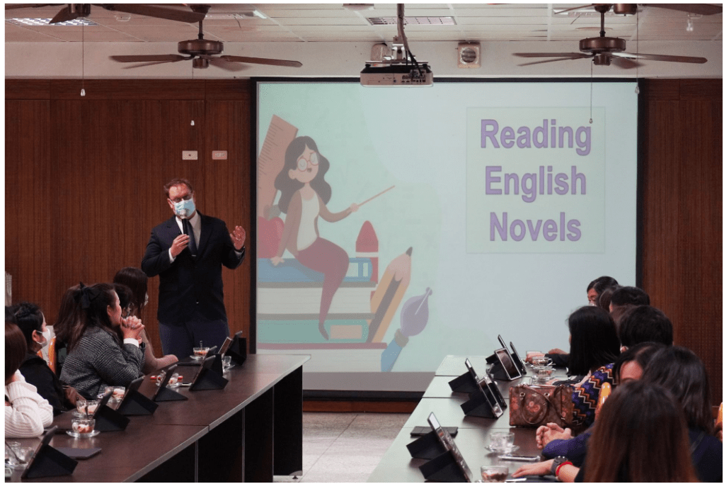 本校外籍教師Chris分享全英閱讀教學,藉由問題設計引導學生理解並思考英文小說內容,透過小組討論活動及期末成果發表,培養學生口語表達能力。藝術大學Suneeta老師對臺南慈中這樣的課程感到很讚嘆,她表示閱讀全英文小說這樣的教學設計在泰國中學是有難度的。