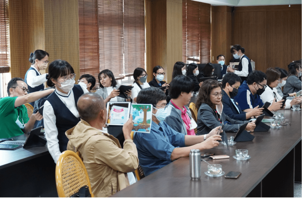 接著由國小部學務處顏秀雯主任分享臺南慈中國小部獲得台美生態學校綠旗認證的經驗,從組織小組到環境檢視、發現問題,例如水資源的浪費及永續食物,接著調查蒐集資料,再到擬定行動方案解決問題,像是光盤計畫、節水follow me計畫,最後執行並監控結果,過程中學生的創意發想、團隊合作及執行力都很令人讚嘆。泰國藝術大學燕芳老師表示,臺南慈中這樣的教育很值得學習,讓學生去發現問題、解決問題,培養學生的批判思考,而不是直接告訴孩子問題的答案,這正是新時代人才所需具備的能力。秀雯主任更帶領貴賓透過水土保持app,透過遊戲學習環境保育知識,在場貴賓都覺得非常有趣。