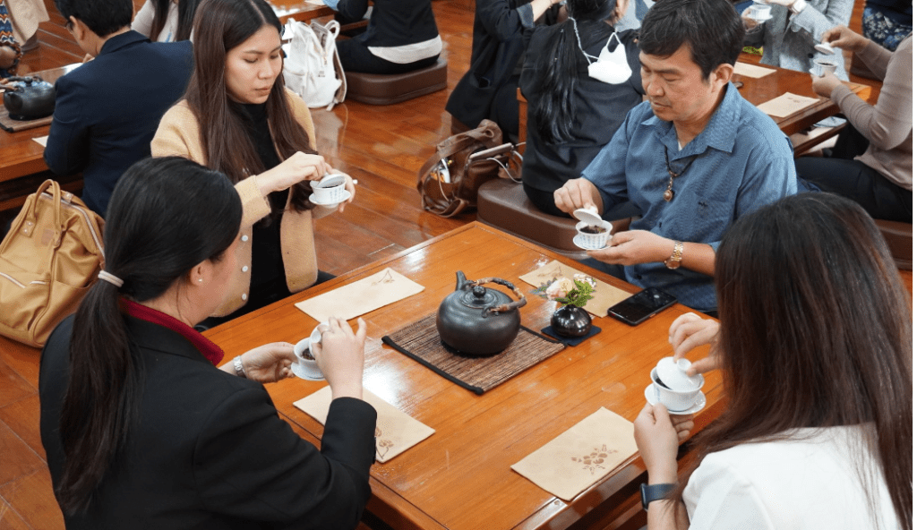 最後泰國藝術大學的老師們進行茶道課程體驗,從一開始的淨手、靜心,體會「淨、敬、靜、境」的慈濟人文精神,從靜思茶道茶之心,涵養冷靜思考心,並學習泡茶與品茶的禮儀,將禮節與美感落實日常生活。泰國藝術大學Wanida老師表示,臺南慈中這樣的課程很棒,教導孩子怎麼平靜心情、放鬆身心靈,可以靜觀自己的情緒,安頓自己的內心。