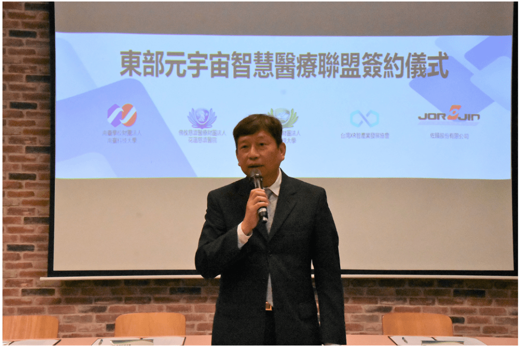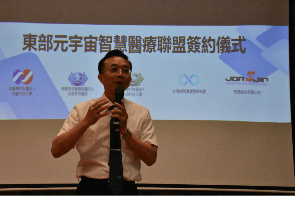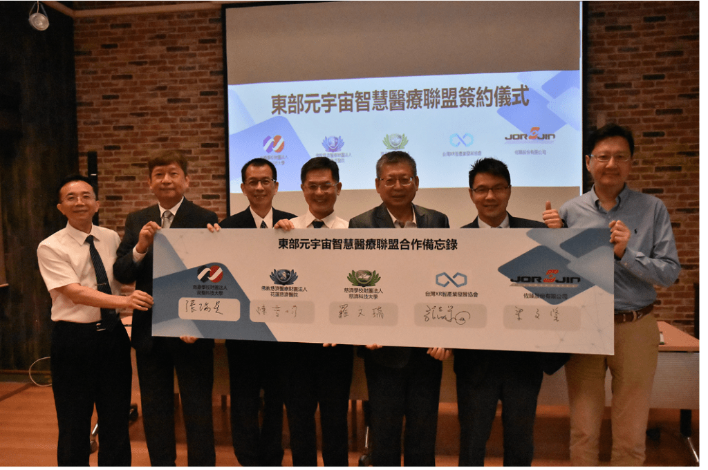 為了積極推動智慧醫療應用合作,五月三日,慈濟科技大學廣邀醫界、學界、產業界,也就是花蓮慈濟醫院、南臺科技大學、台灣XR 智能產業發展協會和佐臻股份有限公司,簽署東部元宇宙智慧醫療聯盟合作備忘錄(MOU)。