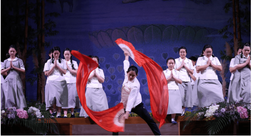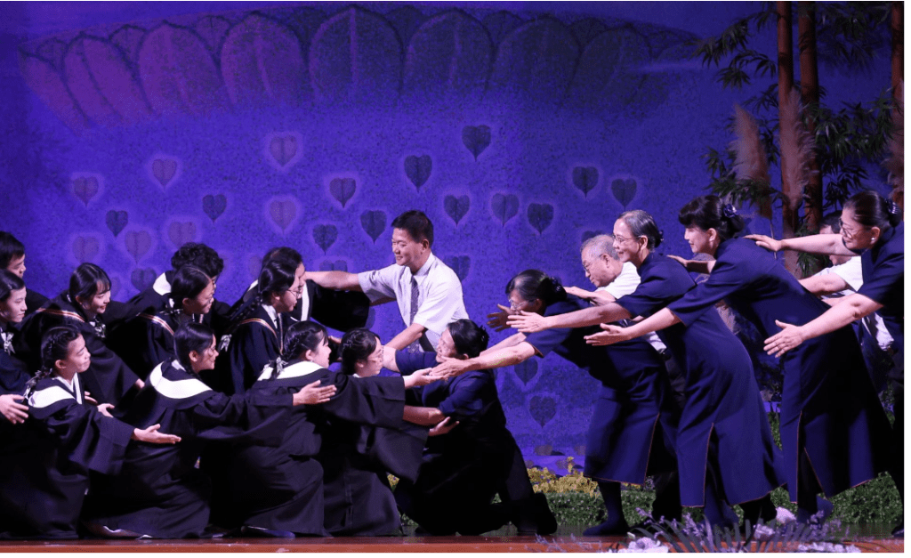 校長羅文瑞與各系師長,以「叮嚀」手語表演,提醒所有畢業生「要發心立願,做社會的棟樑」,而學生以「感恩」回應師長,「是您那慈愛的寬容,給我成長的動力。」師生相互感恩,一起用誠摯的祝福,改寫離別的感傷。
