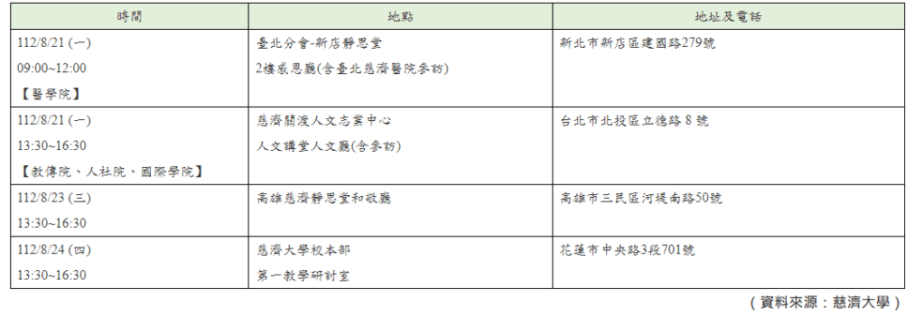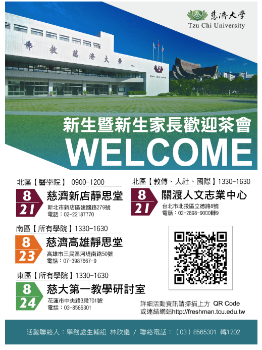 慈濟大學新生暨新生家長歡迎茶會各場次舉辦時間及地點如下: