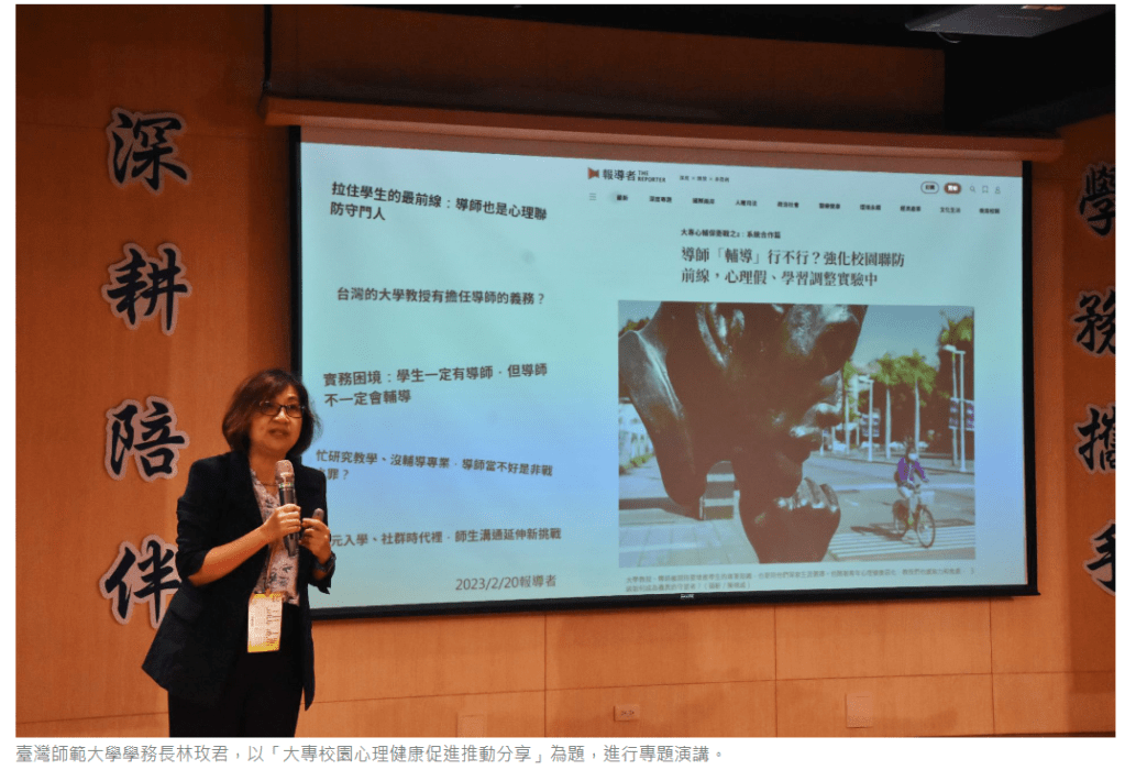 面對大專生自殺通報頻傳、諮商人數屢創新高,臺灣師範大學學務長林玫君,以「大專校園心理健康促進推動分享」為題,進行專題演講。2022年,世界心理衛生聯盟提出「讓全民心理健康福祉成為全球優先」,各大專校院也開設相關課程、活動、自殺守門人培訓、補助精神科醫師鐘點費等,強化心理健康知能。
