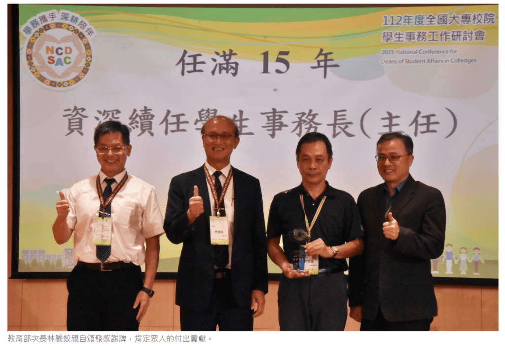 八月十七日至十八日,教育部舉辦「112年度全國大專校院學生事務工作研討會」,共140校、243人(含學務長、學務主任、工作人員等)齊聚一堂,教育部常務次長林騰蛟親自頒發感謝牌,肯定各校學務長、主任的貢獻。