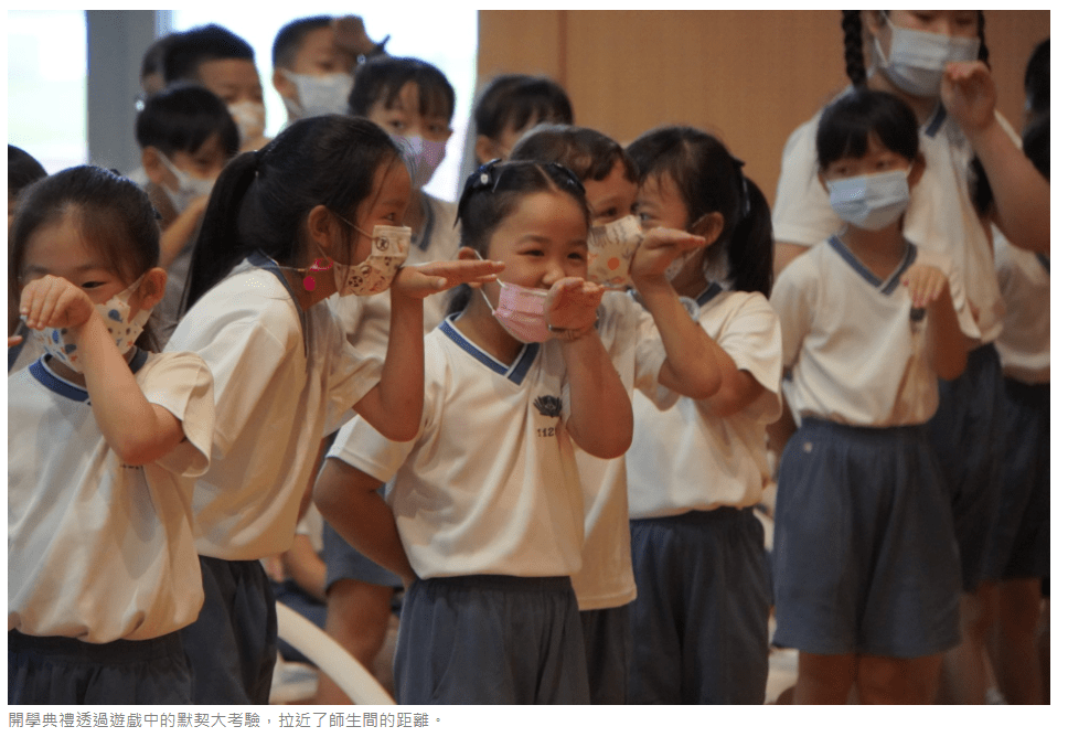 開學典禮上,慧芳老師用默契大考驗來拉近師生間的距離,要與台上師長心電感應,比出相對應的動作,大家都笑得合不攏嘴。