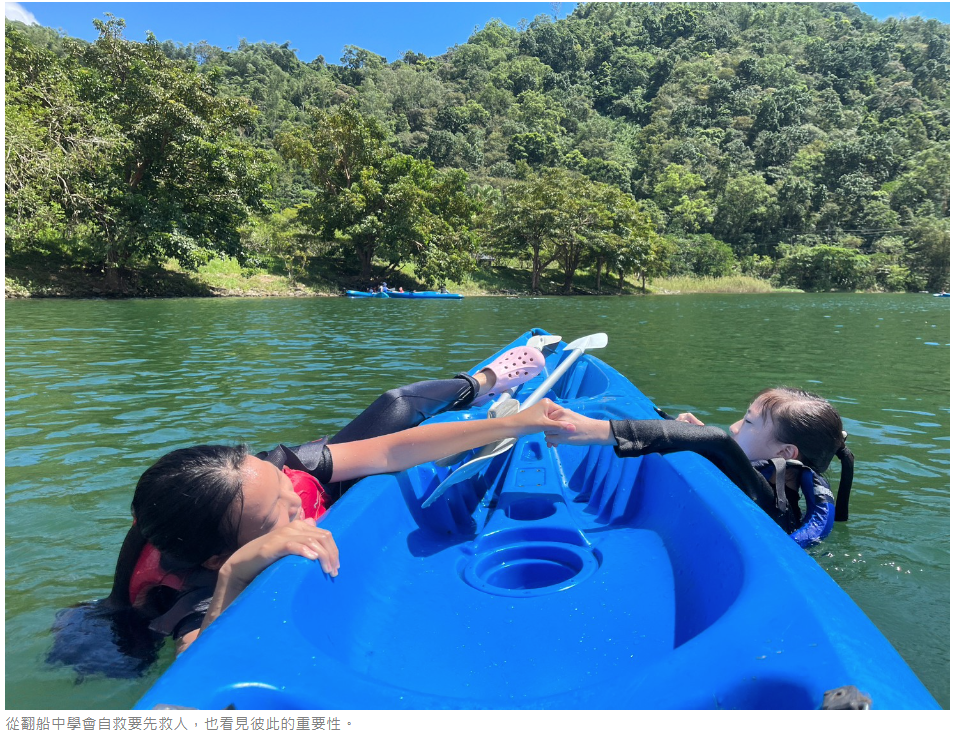 第一站任務是「翻船復位」,同學需在翻船後,想辦法讓自己及伙伴均回到船上後,再一起航行回到岸上才算過關。因為四人一組,考驗更大,只見翻船後,孩子們努力想攀上船沿,但一不小心又再次翻船落水,甚至在救人的過程中,重心不穩,再次翻船,經過多次努力後,才發現唯有兩人彼此互助,才是最快上船的方法,這也是此次課程希望孩子學到的最重要關鍵「看見彼此」。