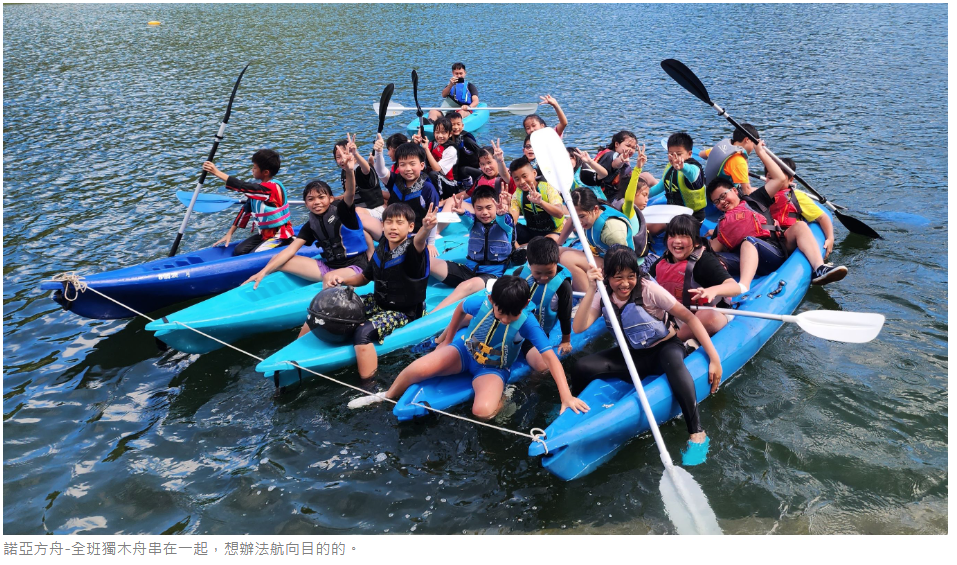 第四站任務「諾亞方舟」,全班五艘獨木舟串在一起,在只有六支槳的情況下,想辦法航到潭中的目的地,過程中孩子們划槳方向不一,甚至落水等,導致船會在潭面上空轉無法前進,後來大家從混亂中找到了方法,就是隊長發號司令「左右、左右、左右」,其他人一起配合,手腳用力划水,最後發現如果每個人都只想當領導者,而不去學著被人領導,那麼就像是一艘多頭的船,難以前進,這一站也是班級團隊合作的最佳寫照。