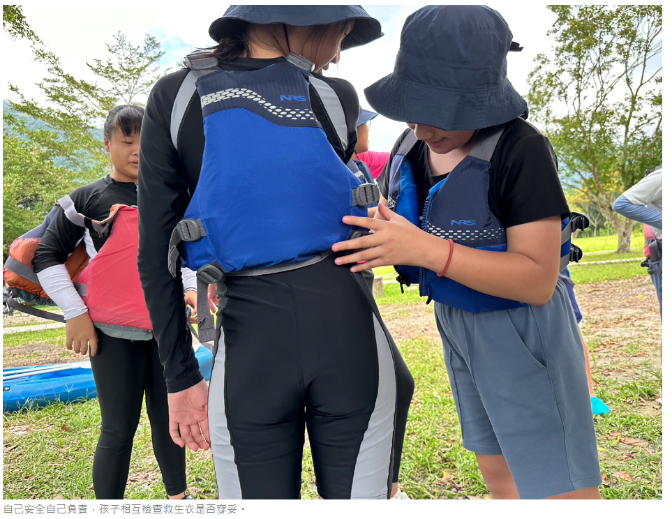 水域安全的第一步就是「自己的安全自己負責」,再好的裝備與技巧,若事先沒有做好安全把關也無效,而獨木舟出航前,得先有一身拿槳與划槳的好功夫,如何判斷前後槳面、正確拿槳、以及前進後退等,都須好好練習一番。緊接著就是下水前的安全防護-穿著救生衣,經教練示範後,全班同學不分你我,穿好救生衣後,相互協助確認扣繩、同心協力為彼此的安全把關。