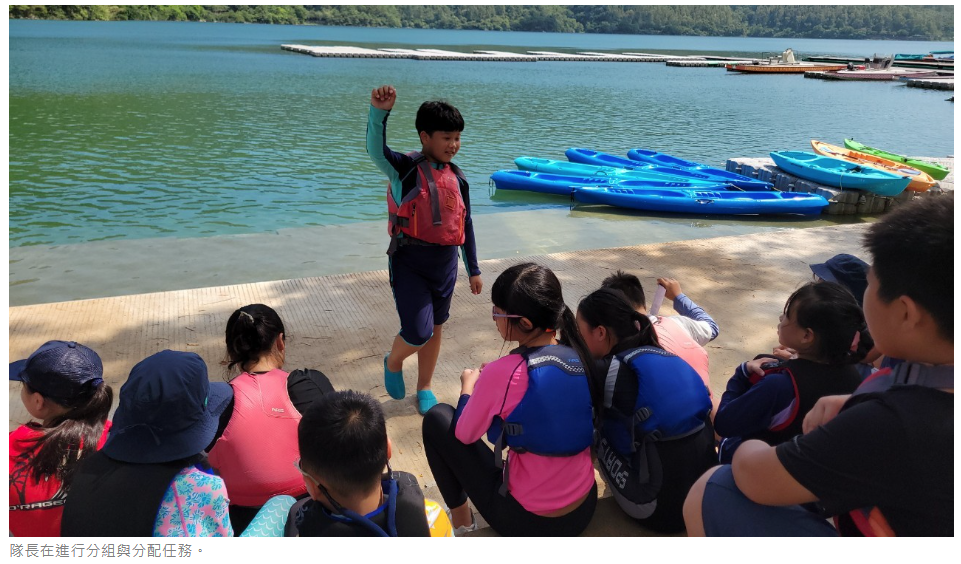 當孩子們都學習好一身好功夫後,就是任務挑戰的開始,也是孩子自主學習的開始,過程中老師均在一旁觀看,不參與指導,由各班推選出的隊長分組與分配任務,只見隊長穿梭在人群中,努力發揮他的溝通協調與領導能力,一再跟組員確認。孩子們各個摩拳擦掌、躍躍欲試,炯炯有神的目光一致望向潭中四個代表任務的浮標,教練一聲令下,孩子們馬上蜂擁而上,跳上獨木舟,努力朝目標邁進。