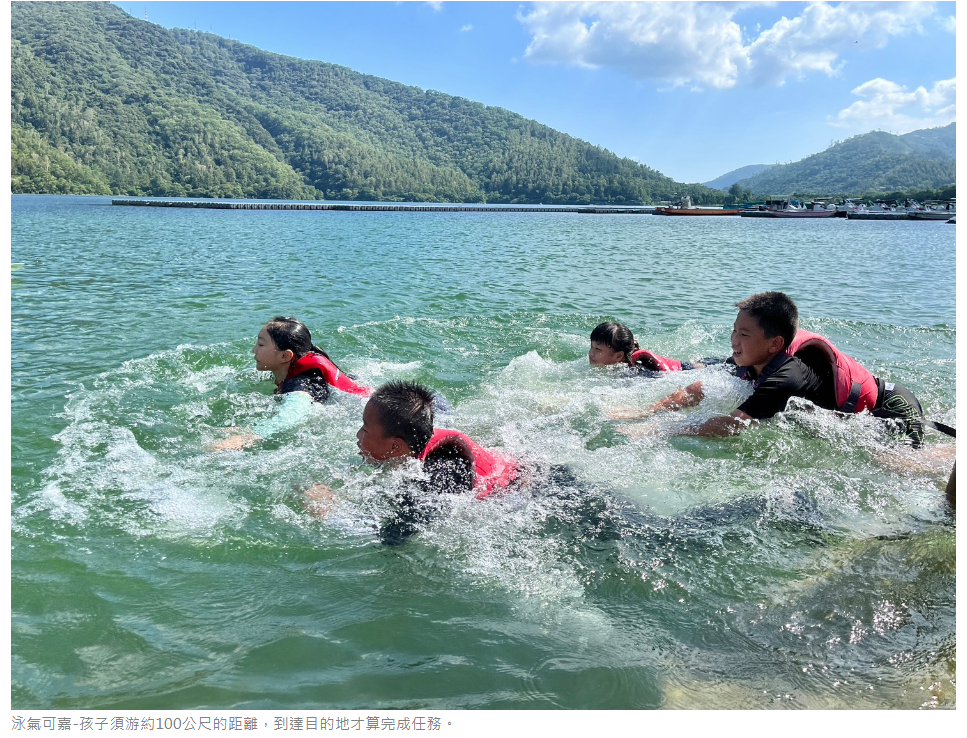 第二站任務「泳氣可嘉」,孩子須游約100公尺的距離,跟潭中另一組同學接力後,再由此組同學游回岸上才算完成任務,這是學了四年游泳課的最佳檢核。這時只見岸上的小朋友加油聲不斷,為潭中游泳的同學打氣,甚至有提早抵達岸上的同學再次下水陪伴較慢的同游回到岸上,短短100公尺的距離,看到了同學間最真摯的友誼。五年三班王詠駿分享:班上龐容平時總是安安靜靜不太說話,可是在這一關,卻見她如游泳健將般游得非常快,抵達岸上後,立刻又跳下水,回過頭去陪伴班上另一位落後的同學游回岸邊,身為隊長的他不僅佩服她的泳技,對她如此幫助同伴的行為更是感動。