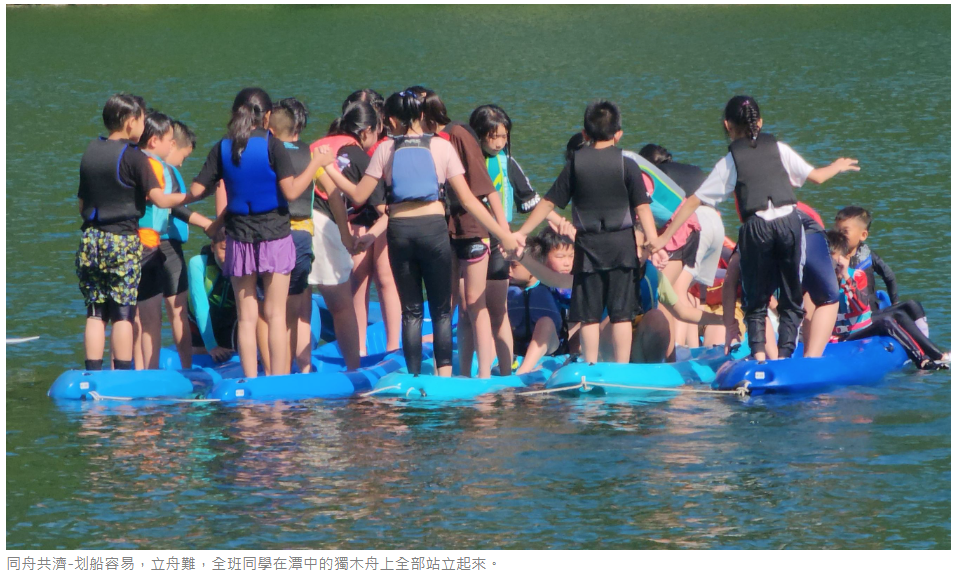第三站「同舟共濟」,划船容易,立舟難,全班同學在潭中的獨木舟上全部站立起來,這是非常大的考驗,過程中因為彼此沒有默契,或因重心不穩陸續落水,甚至因為急著分享自己的看法,聲音大到無法溝通,隨著落水次數增多,聲音開始變小,有開始伸出手,拉同學一把,有人互相幫助穩住重心,雖然經過40分鐘的努力才完成此艱難任務,但在過程中,孩子們學到「把心打開,聽到別人的聲音,看見彼此的重要」,這才是最難得的經驗。