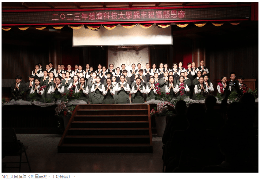 特別的是,76位師生共同演繹《無量義經-德行品、說法品、十功德品》。連續參與四年歲末祝福手語演繹的資訊科技與管理系四年級學生陳星潔(馬來西亞籍)表示,不想錯過畢業前的最後一次歲末祝福,也格外珍惜慈濟學生才能領到的福慧紅包,期許自己進入職場後,能發揮良能,更希望家人平安健康。