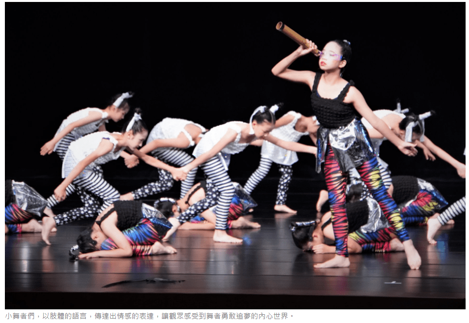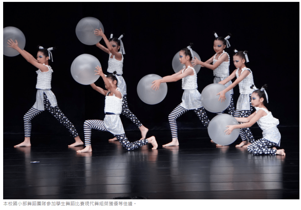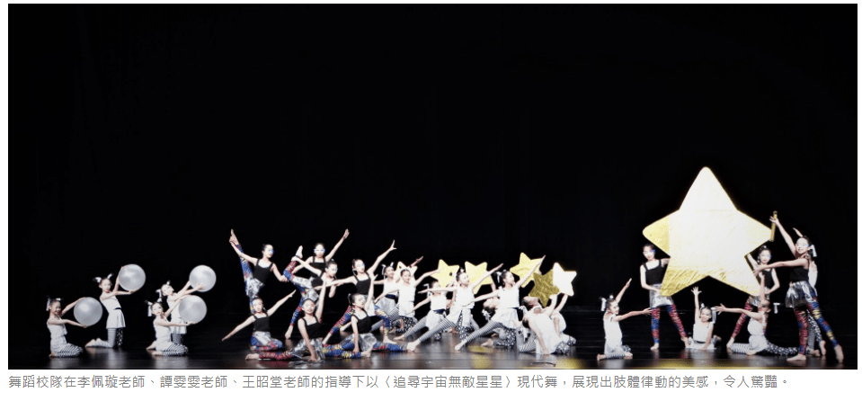 舞蹈校隊在李佩璇老師、譚雯雯老師、王昭堂老師的指導下則以〈追尋宇宙無敵星星〉現代舞,展現出肢體律動的美感,令人驚豔。小舞者們,以肢體的語言,傳達出情感的表達,讓觀眾感受到舞者勇敢追夢的內心世界,也象徵著靜思語所說:面對困難若能具足信心、毅力和勇氣,則無事不成。六年級吳羽棠同學連續幾年參加舞蹈比賽,今年已是最後一年,她提到:雖然參加好多次,但是比賽前還是會有一點緊張,因為大家一起打氣,一上台,緊張心情就緩和許多,覺得自己表現的相當不錯!周恬安表示:練習了好久,終於到了比賽這一天,大家都好期待,因為很專注在表演,才能忘記緊張,跳舞讓人覺得開心與快樂。