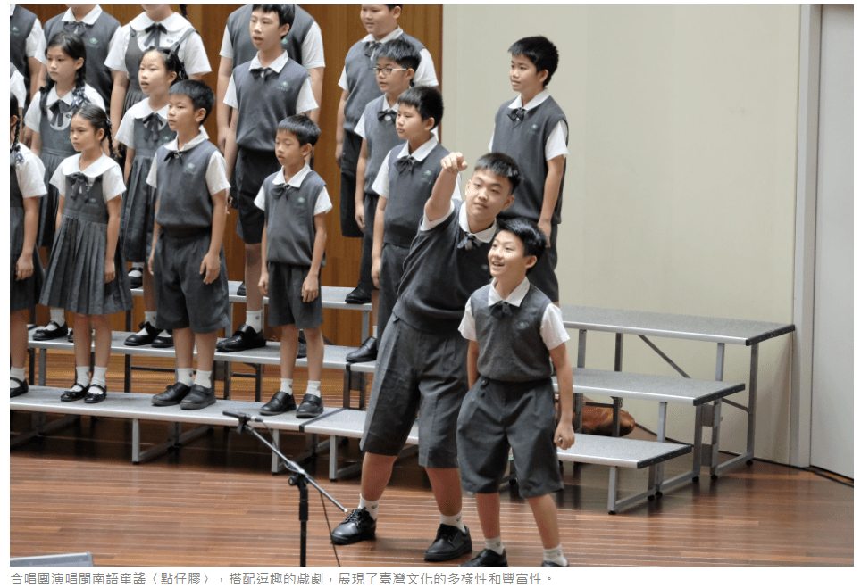 從創校即成立的合唱團在廖祝琳老師、吳怡恩老師的指導培訓之下,演唱出童趣的〈點仔膠〉和優美的〈世界恬靜落來時〉兩首閩南語歌謠,搭配逗趣的戲劇、優美舞蹈,充分展現鄉土底蘊,詮釋人文涵養,感受臺灣文化的多樣性和豐富性。六知足吳若妍分享:很開心能加入合唱團校隊,讓我學會要專注練習看指揮,細心的聆聽伴奏,邊唱邊聽彼此的聲音,融合成最完美的歌聲。