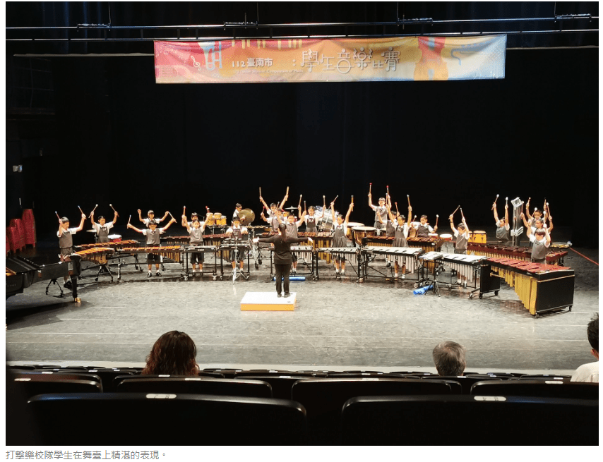 台上一分鐘,台下十年功,為了成就比賽,學生的辛勤練習、團隊合作是致勝關鍵之一,每一位團員無不專注投入,不斷不斷地練習、一再一再地修改,才能成就舞台上耀眼的演出。此外,更要感恩的是多位老師們的專業用心指導:打擊樂何春頤老師、吳慧芳老師、馬友容老師們從懵懂的小C團教導視譜、節奏以及正確的拍點,到能站上台參加比賽的A團,這次比賽演奏〈寶島的地圖〉以及〈雪燈籠/白虎〉,長達13分鐘的樂曲,團隊成員全程背譜,年紀雖小卻不容小覷,舞台上各個琴藝精湛、自信滿滿,充分享受擊樂的樂趣,三位老師的指導實在功不可沒;打擊樂隊的成就,來自於每位成員的努力和團隊合作,每一位幾乎都是從國小部開始接受打擊樂訓練,進入國中部、高中部後繼續投入,不管是臺南市甚或是全國比賽,學長學姐們一起幫助學弟學妹搬運樂器,相互加油打氣,共同完成了這次比賽。