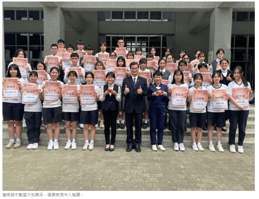 臺南慈中今年繁星68位申請,37位上榜,總錄取率為54%,目前已超過2成以上高三生為準大學生,其中國立大學人數高達20位。放榜後校園氛圍歡欣鼓舞、振奮激勵後續個人申請及分科測驗的學生士氣!