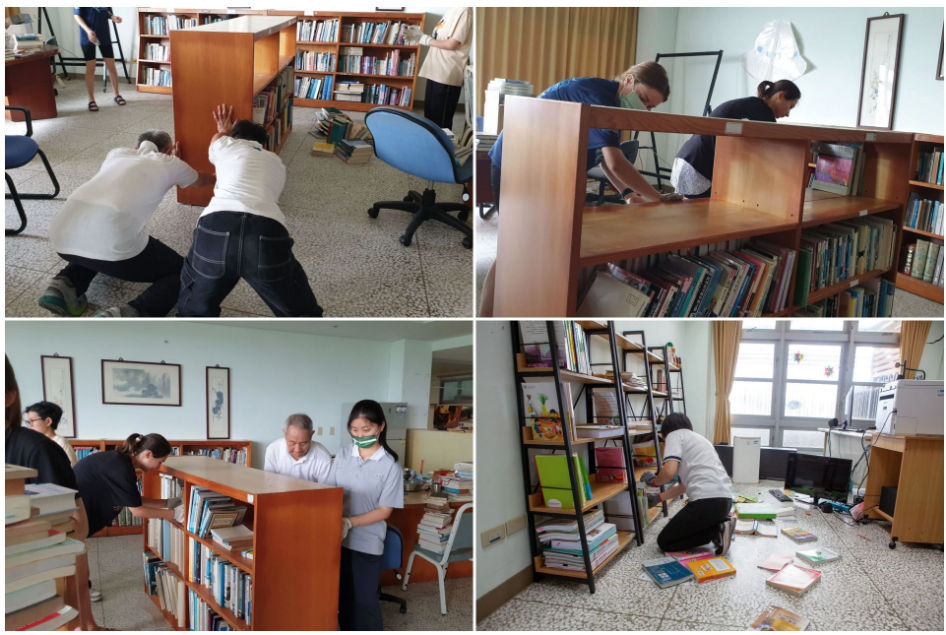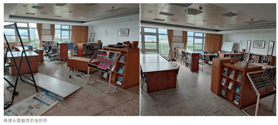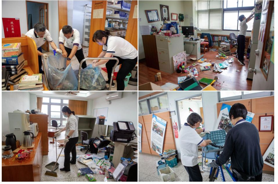 復災說明會結束後,同仁們便馬上返回各自辦公區域開始進行整理。教育傳播學院所在的大愛樓,也是這次校園中受損較嚴重的地方,辦公室位在12樓的同仁,憶起當日狀況仍是心有餘悸,看著傾倒移位的設備,同仁們樂觀的說,師生都安全就好,設備部分會先盤點受損狀況,再依教學所需進行後續增購。