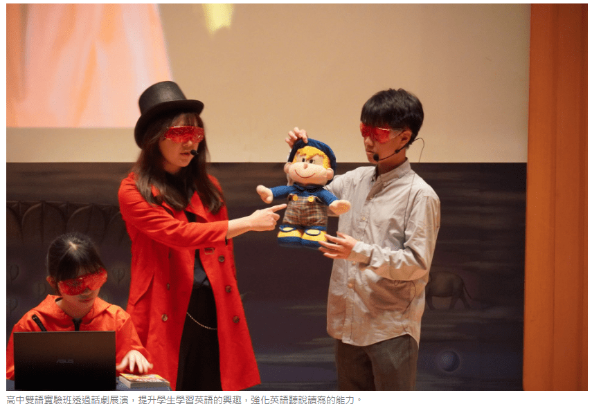 高中部則是規畫在高一年段練唱英語歌唱,透過音樂的旋律學習語言,此外語言實驗班也定期辦理英語話劇展演從劇本角色台詞的口說練習發展學生自主學習與終身學習英語文的能力與習慣。