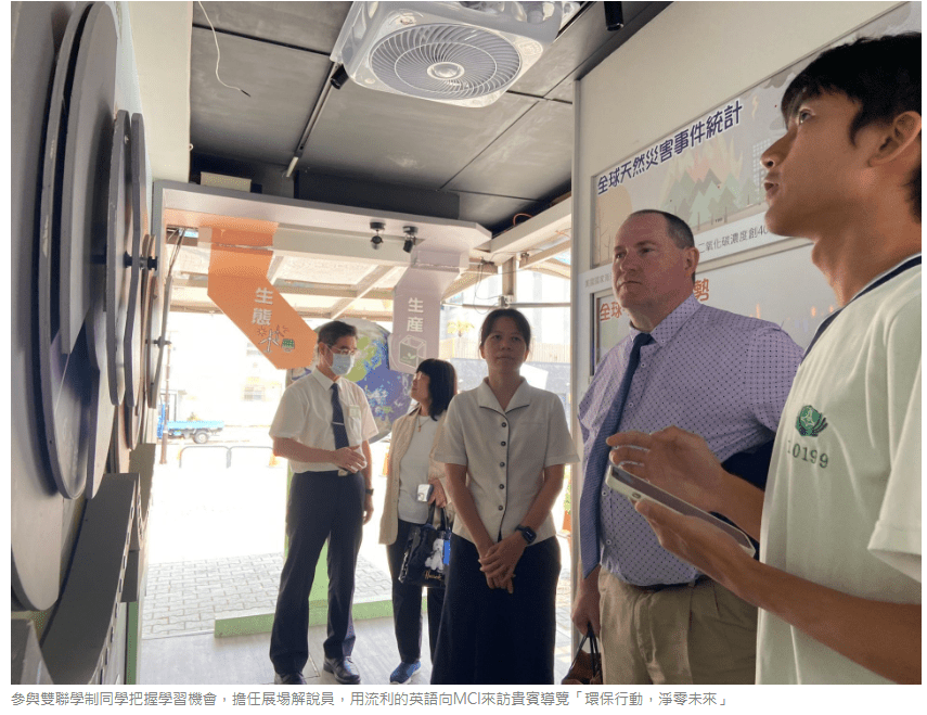 MCI來訪期間適逢學校正在推動世界地球日主題活動「淨零未來」行動環保教育車展覽,雙聯同學把握學習機會,擔任展場解說員,用流利的英語向MCI來訪貴賓說明「環保行動,淨零未來」慈濟學校環境教育的核心價值。