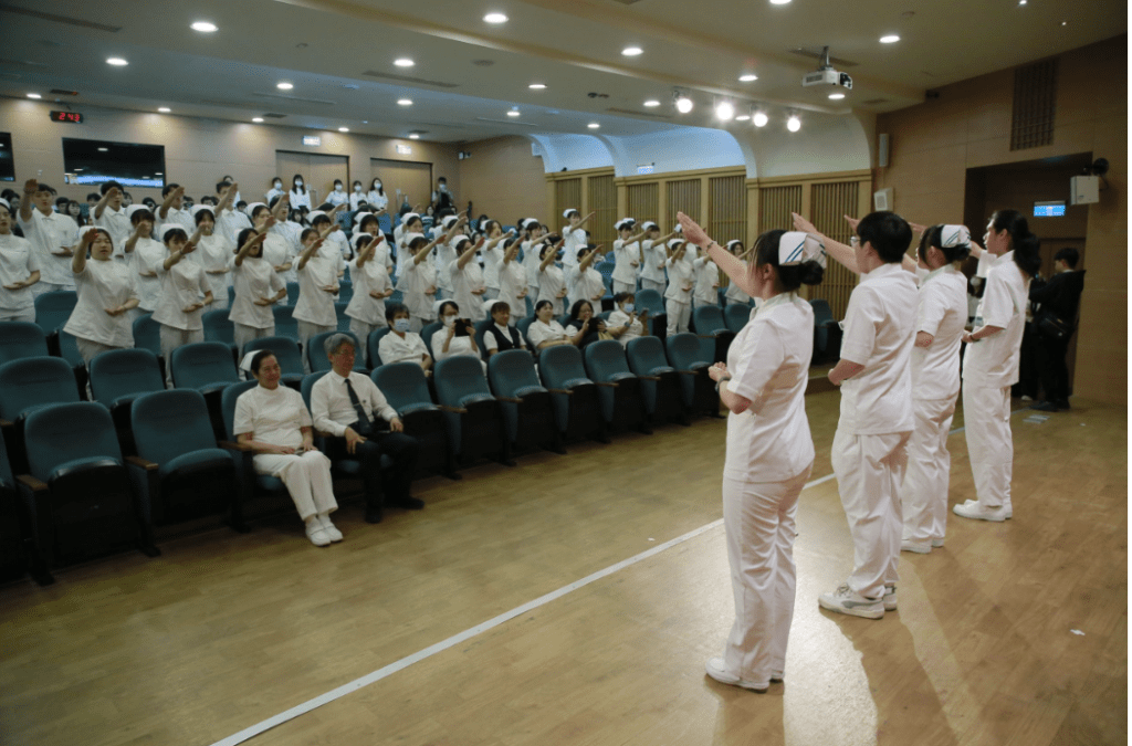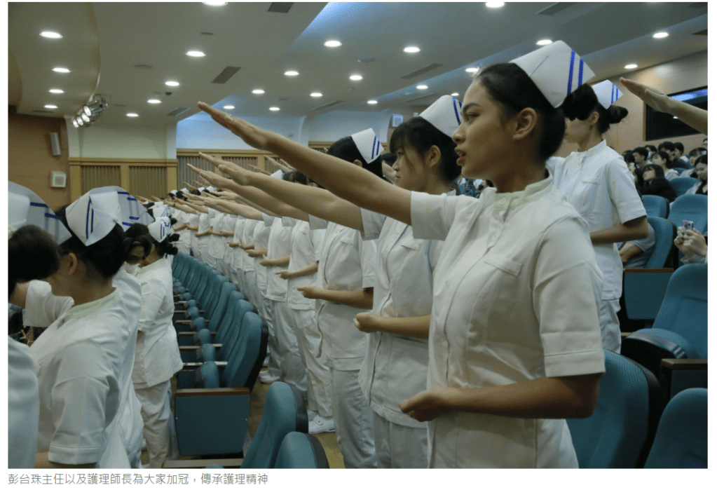 受冠生舉起右手宣誓:「心存大愛,胸懷感恩,尊重生命,視病如親…..」堅定宏亮的聲音在典禮現場響起。0403地震發生後,護理系歐陽安琪老師號召了大二到大四9位同學加入慈濟志工行列,其中五位是這屆的加冠生,協助到德興棒球場搭帳棚李昀蓁同學說:「老師常教我們要做一個手心向下的人,透過志工服務親身體驗到幫助別人的重要,也期待自己未來可以幫助更多人。」