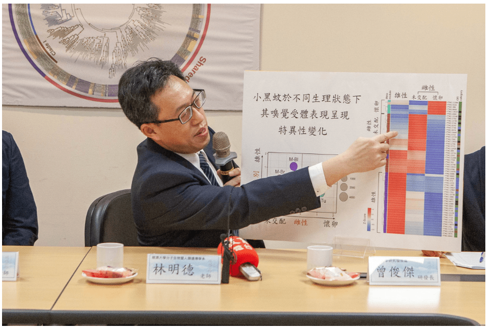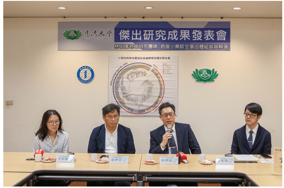 今日(4日 )慈濟大學舉辦記者會,包括慈濟大學曾俊傑研發長、林明德老師、中研院林仲彥老師、呂美曄老師與大家分享小黑蚊的研究過程與成果。曾俊傑研發長表示,小黑蚊到目前為止都還沒有有效的防治方法,因為小黑蚊只有0.14公分,研究困難度非常高,感謝林明德教授與中研院的合作,完成了小黑蚊基因體的定序解碼,未來可以有很好的應用。