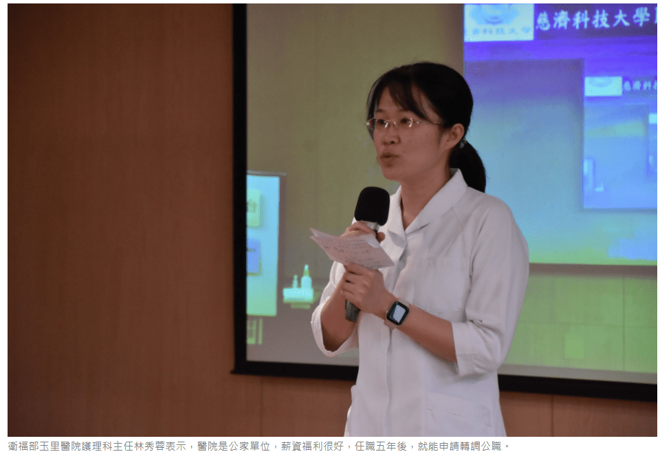 衛福部玉里醫院護理課主任林秀蓉表示,醫院是公家單位,薪資福利很好,也很穩定,通常任職五年後,就能申請轉調公職。其實,自己也是慈濟護專第五屆畢業校友,所以,很放心把公費生交給母校栽培,也希望花東子弟,可以留在家鄉服務。