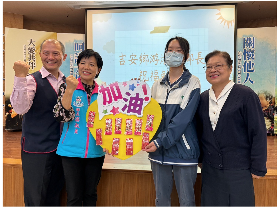 校長姊姊李玲惠、吉安鄉長游淑貞、家長會長劉鈞安等人集結一堂,給考生們最後的祝福。游鄉長除了送上「狀元及第」鑰匙圈,讓孩子們可以繫在書包上,祈求保佑與祝福,她說,走過多所學校,看過許多國三考生,她盛讚慈中學生是最穩定、也是最有自信與紀律的學生,她說,在人文風氣韻養下的孩子,就是展現不一樣的風采。
