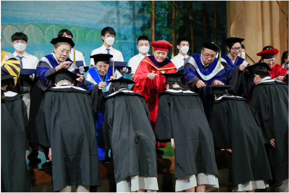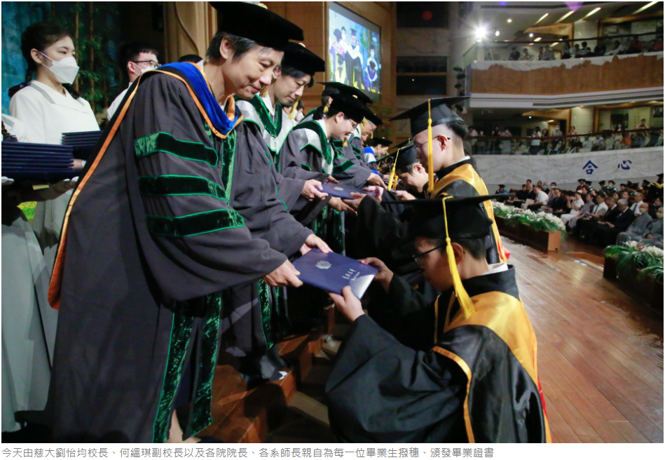 今天由慈大劉怡均校長、何縕琪副校長以及各院院長、各系師長親自為每一位畢業生撥穗、頒發畢業證書,期許透過師長傳承,將慈濟精神帶到全球各個角落。