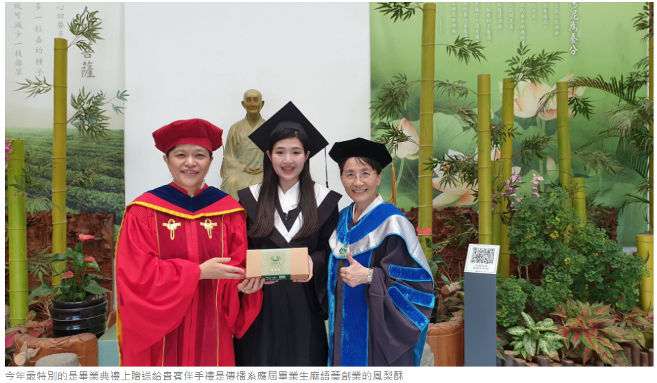今年最特別的是畢業典禮上贈送給貴賓伴手禮是傳播系應屆畢業生麻語蕎創業的鳳梨酥,住在光復的麻語蕎同學成長在單親家庭,大一就開始賣鳳梨酥,商標形象設計都是自己來。麻語喬同學表示在學期間受到慈誠懿德會的支持,常常收到來自他們的訂單,也利用課餘到市集擺攤,靠自己的力量完成學業。麻語喬同學說:「非常感謝校長和學校對我的支持,感謝慈誠懿德爸爸媽媽的愛,能在慈大讀書是非常正確的選擇。」