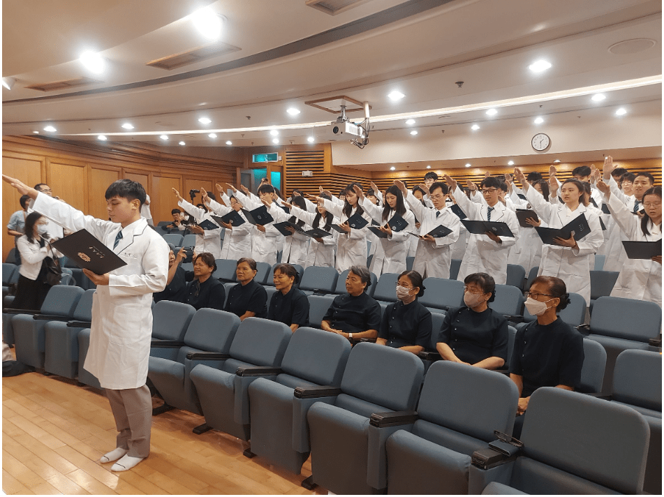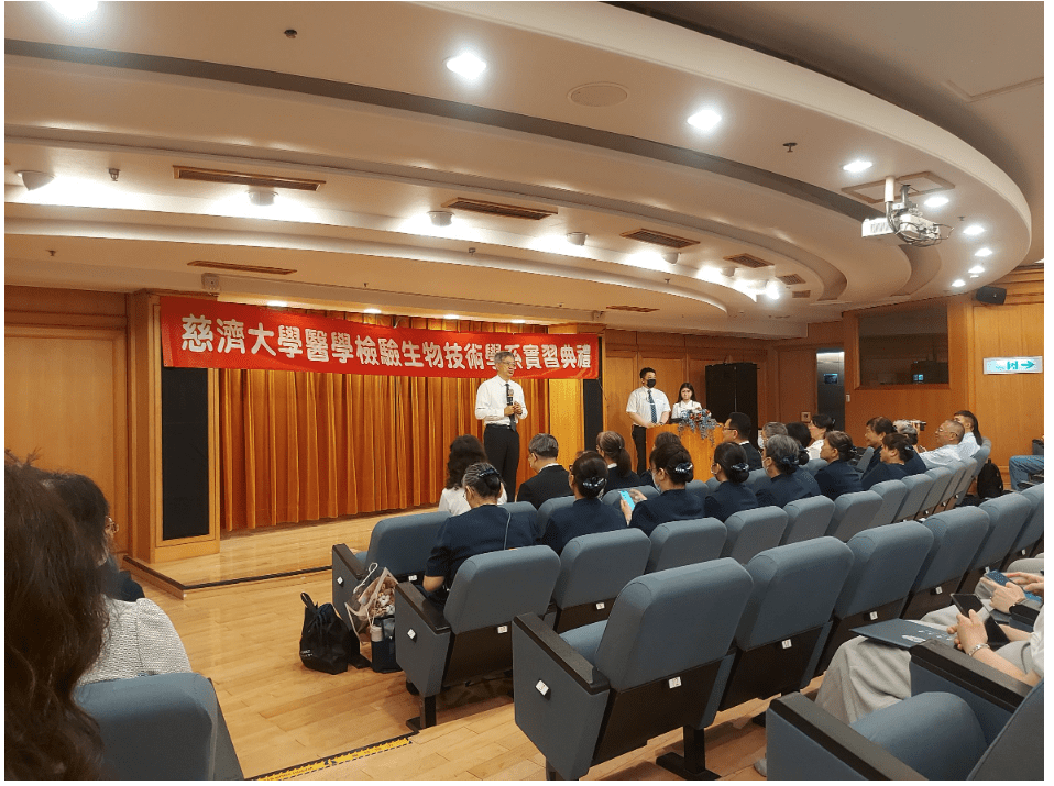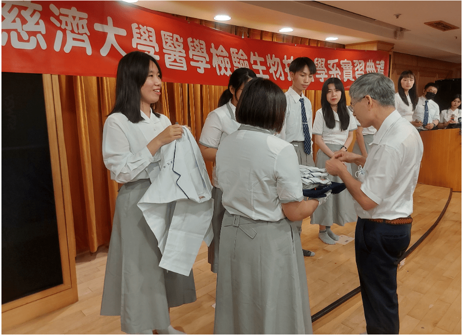 慈濟大學醫學院陳宗鷹院長致詞表示,進入臨床對學生來說是邁入一個新的里程碑,因為可以去醫院真正應證學校所學的知識。Covid-19疫情期間,醫檢師發揮了很大的功能,而醫檢師未來非常有願景和值得期待,因為不管是開發新的檢驗技術、篩檢疾病的技能,基因定序…等,未來的精準醫療、智慧醫療,檢驗都是不能缺少的一塊,因此希望同學們進入臨床後認真的學習,運用專業知識、以精湛的技術去幫病人做更好的檢驗,當然態度也很重要。温蕙甄學務長說,相信同學們都懷著興奮的心情,因為終於將獨當一面跨入半個社會,代表學校祝福同學們,在未來實習除專業外,還能發揮在校所學人文精神及利他服務。