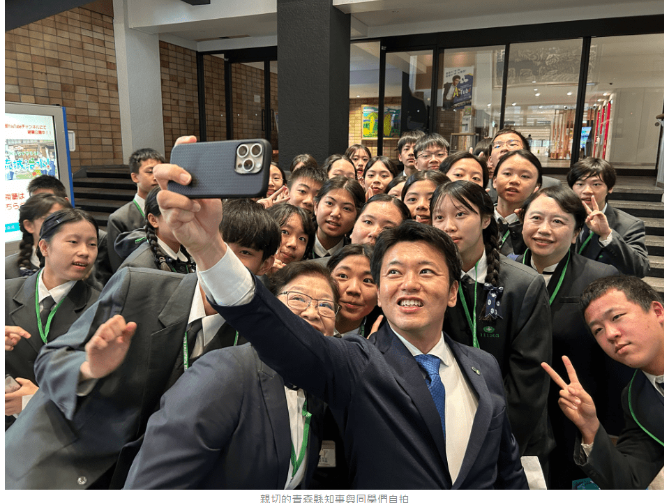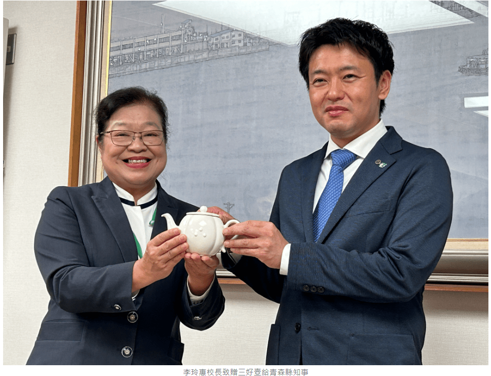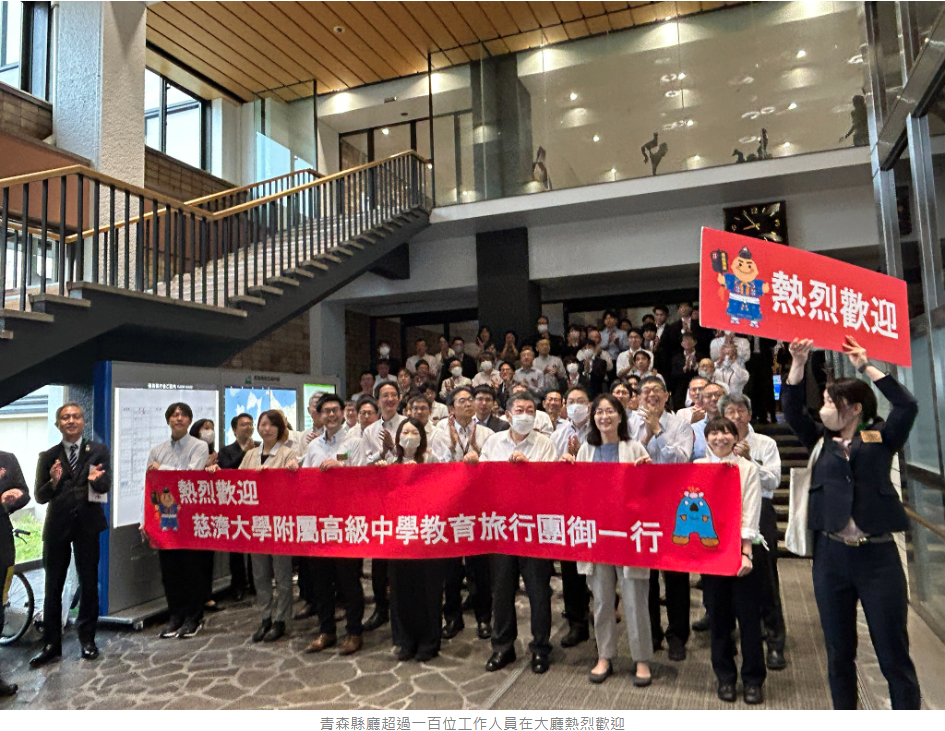 慈大附中自2017年開始辦理日本教育旅行,此行是第五次造訪青森。五月二十七日前往青森縣廳拜會時,去年甫上任的青森縣知事宮下宗一郎與超過一百位縣廳工作人員於大廳用中文齊喊「大家好」,熱烈迎接慈中師生的到來。慈中同學則以九十度鞠躬禮和連喊三聲的「Aomori大好き」熱情回應。在貴賓接待室中,宮下知事首先致詞歡迎慈中師生的到來,接者邀請大家舉起桌上的青森蘋果汁,相互「乾杯」致意。李玲惠校長致詞時,首先感恩宮下知事於花蓮大地震發生後,即來信慰問,接著分享同學們在農家Homestay感受到的人情與美好。校長還致贈靜思人文的「三好壺」和花蓮名產,並說明「三好」就是「口說好話」、「身行好事」、「心發好願」。