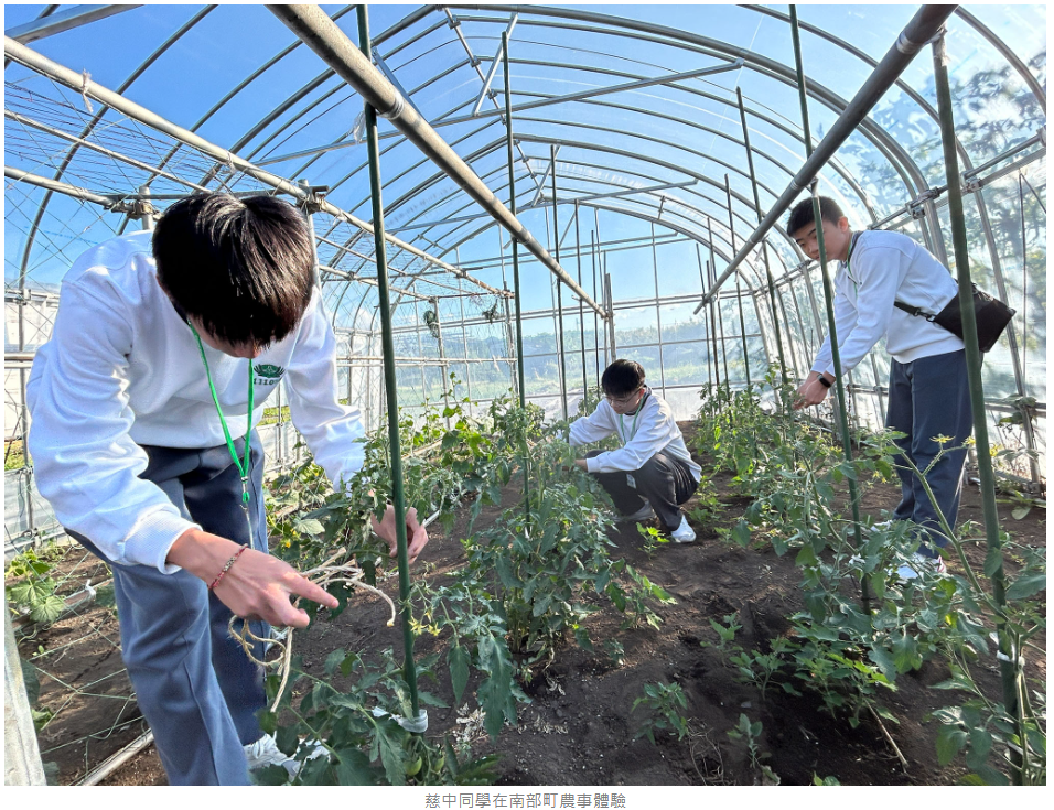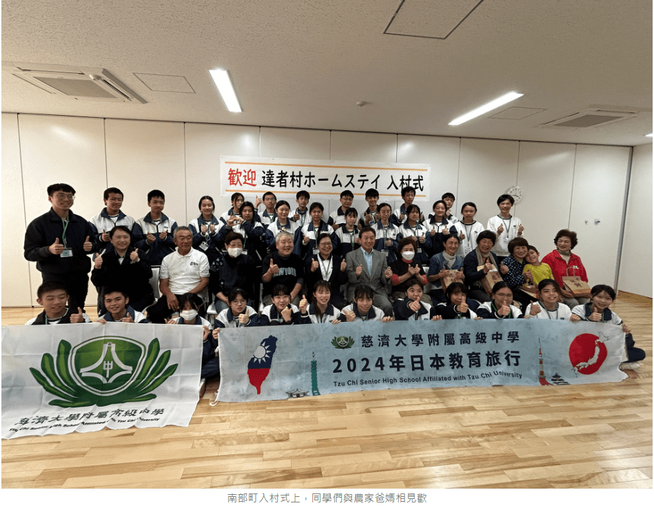 青森是日本的農業大縣,蘋果產量高居全國第一。此行,慈中師生亦到南部町農家寄宿一晚,體驗最真實的日本農家生活。同學們在果園裡協助將蘋果、櫻桃疏果、也幫忙寄宿家庭準備晚餐。晚餐過後,有的家庭帶同學們去公共澡堂泡湯,有的讓女同學們穿上和服拍照,還有媽媽取出家傳的武士刀,讓學生們小試「身手」,還有一家則教學生雕刻葫蘆,並把慈中校徽刻在葫蘆上。為了感恩農家的接待,每戶同學皆以茶道課所學習到的禮儀,恭敬地奉茶給寄宿家庭爸媽,令爸媽們相當感動。在離村式上,八十多歲的田中奶奶分享同學們一起為田中爺爺唱生日快樂歌慶生的溫馨與感動。她說:「現在日本的年輕人不可能為老人家做這些事。」曾到過臺灣的田中女士,本來就對台灣有很好的印象,經過此次的互動,令她更想再造訪台灣。