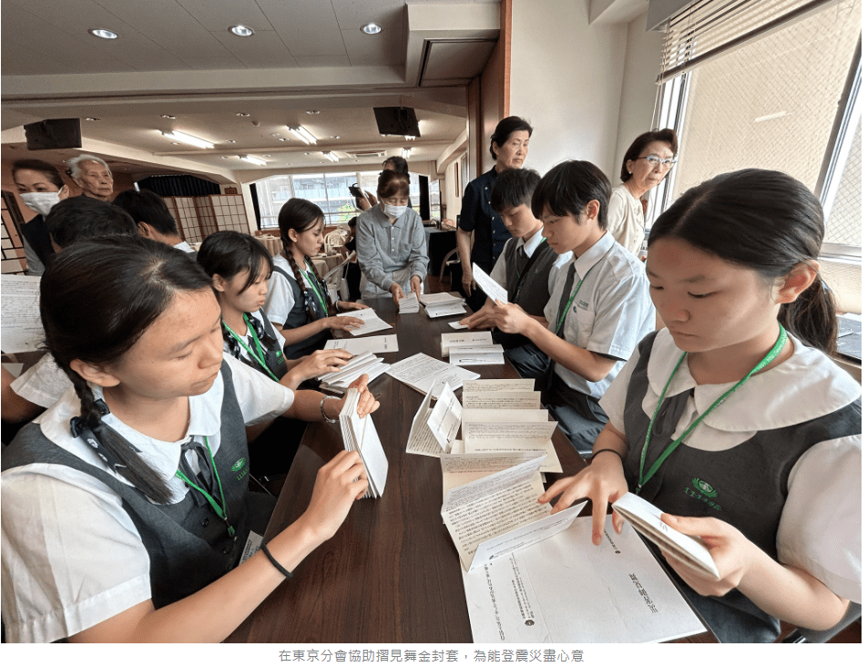 除了青森縣外,慈中師生亦轉往東京進行國際志工服務。在東京慈濟志工的帶領下,同學們與十一位街友一起清掃代代木公園,並前往慈濟東京分會,聆聽慈濟志工在能登半島的賑災分享,並幫忙摺即將發放給能登受災民眾的見舞金(慰問金)封套,以及用日文寫卡片鼓勵能登災民。高一大愛班楊宛諭同學說:「寫卡片時很希望自己的心意能傳遞給災民,希望他們收到見舞金和我們的卡片,可以很開心,有更多力量繼續重建他們的家園。」