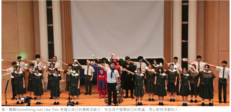 接下來上場的是高一善解,表演的曲目是Something Just Like This。同學們唱作俱佳,扮成超人和蜘蛛人來具體呈現出歌詞的涵義。就算不是超人,也能以自己的優勢及能力,在生活中發揮自己的長處,用心對待深愛的人。