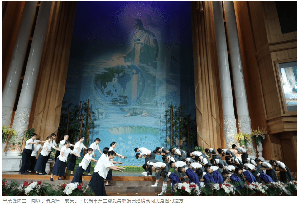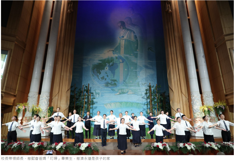 靜思精舍的德諦師父、德璒師父也親臨畢業典禮會場,祝福畢業生。德諦師父期許同學們將老師們所傳遞的愛的精神,具體去實踐、付出,不要小看愛的力量,如大海由點滴匯聚而成,每個人的力量匯聚成的大愛也能讓世界亮起來。