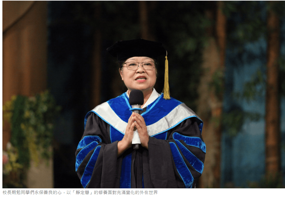李玲惠校長除了肯定同學們的踏實努力,也以「有禮」及「學習不斷電」勉勵畢業生。禮貌是人生道理,越是有禮貌的人,越容易得到善知識,也比別人更容易遇到「貴人」。校長期勉同學們永保善良的心,以「靜定慧」的修養面對充滿變化的外在世界。