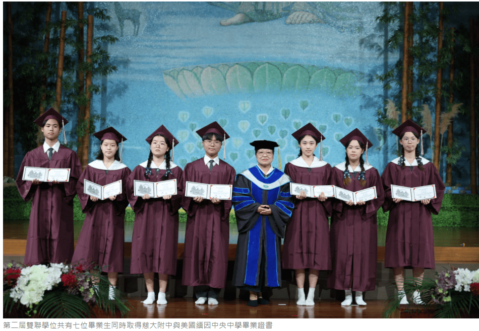 慈大附中與美國緬因中央中學(MCI)合作雙聯學位,在今年有了第二屆畢業生。今年共有七位高三畢業生同時獲頒二張畢業證書,他們自高一開始參加雙聯學位,歷經三年每週四小時的同步課程與一個月的實體課程,紮實學習,終於順利取得兩校的畢業資格。MCI校長David Pearson特別錄製影片恭喜同學,期勉同學常保好奇心,並宣布七位同學此刻起成為MCI的畢業校友。